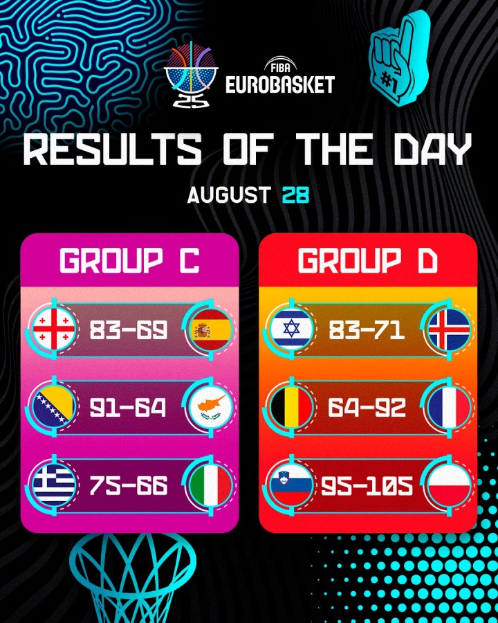 08月29日讯 男篮欧锦赛次日六场比赛结束,全部赛果如下: