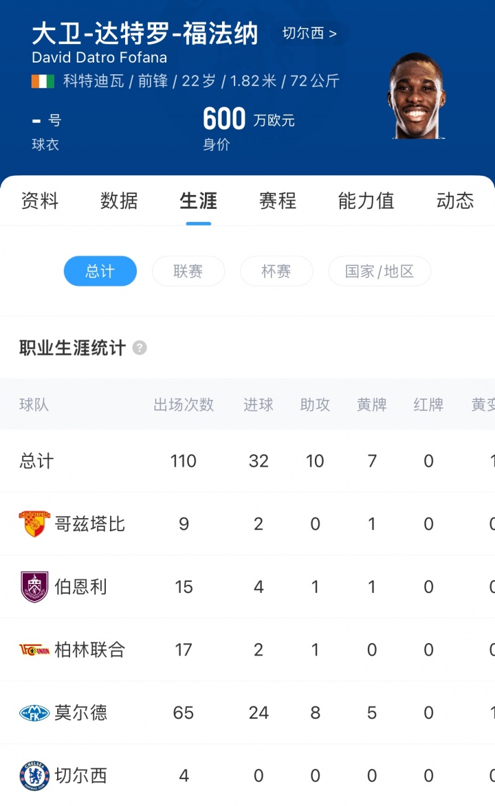 这位科特迪瓦球员上赛季前半程曾租借效力于哥兹塔比,其职业生涯始于2020-2021赛季的莫尔德俱乐部。在莫尔德65场比赛中攻入24球的福法纳,于2022-2023赛季转会至英超劲旅切尔西。这名射手还曾租借效力于柏林联合和伯恩利俱乐部。