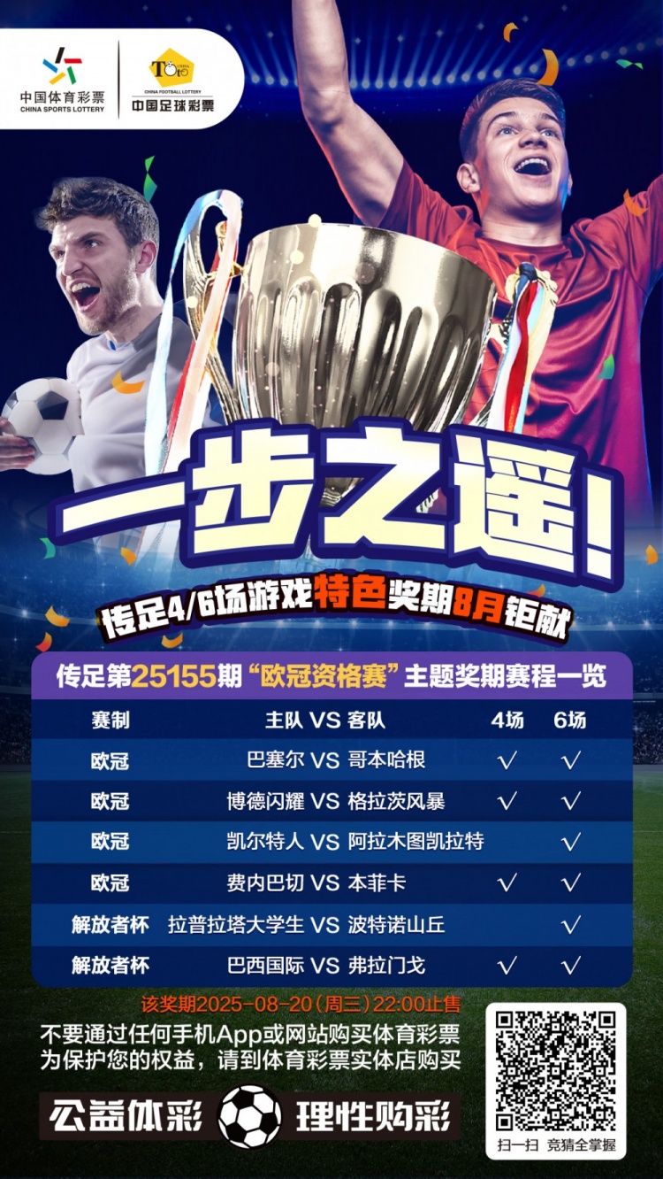 第25155期传足4/6场游戏特色奖期已经于2025年8月17日20:00开售,将于2025年8月20日22:00停售,并于8月21日开奖,其中巴塞尔VS哥本哈根、博德闪耀VS格拉茨风暴、费内巴切VS本菲卡、巴西国际VS弗拉门戈为4场进球游戏竞猜赛事。